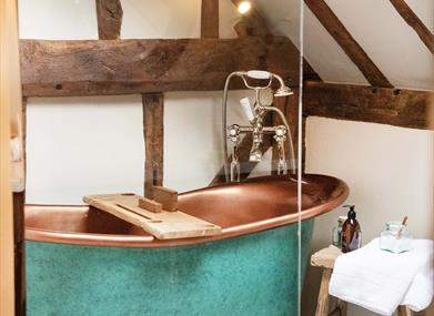 The Hop Press is the largest bedroom, with a Super King-sized bed, walk-in shower, beautifully appointed copper bath, large vanity unit, separate toilet and plenty of cupboard space. The original beams, revealed during renovation gives additional height to the room. The unique windows & skylights in this bedroom allow views of the surrounding gardens, ancient woodland & vineyards.