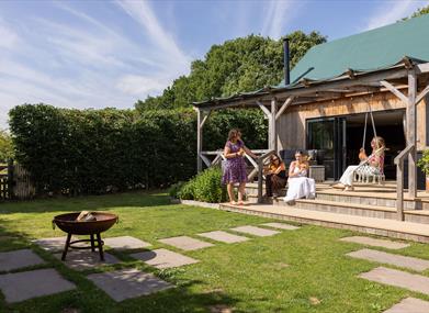 Fern Lodge sleeps 6. It has a fabulous master bedroom with a canopied ceiling and a secluded balcony looking to the South Downs, perfect for a morning coffee or an evening tipple. Downstairs there's another bedroom with access onto the deck, and a curtained alcove bed handpainted with the night sky above. The garden has a gate that looks over into the wildlife meadow, you can watch deer and birds forage from your hot tub. There's space to play in the garden and a fire pit to enjoy toasting marshmallows on.