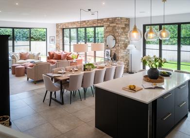 Step inside to discover a light-filled open-plan living, dining, and kitchen space at the heart of the home. Here, floor-to-ceiling bi-fold doors open onto the garden, blending indoor and outdoor living. Snuggle up by the log burner with a glass of wine after a countryside walk, share long dinners around the dining table, or throw open the doors on a sunny day to let fresh country air fill the space.