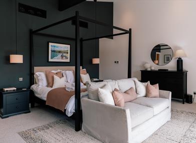 The master suite is a retreat of its own: a super king bed, walk-in wardrobe, spa-style en suite, and even a cozy office nook if you need to catch up on work during your stay. A sofa bed here offers additional sleeping space, making it ideal for families with little ones. Each bedroom is thoughtfully designed to ensure a restful night's sleep, with soft linens, calming colours, and quiet surroundings.