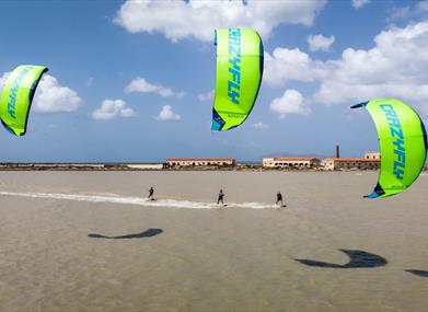 Not only do we teach kitesurfing, we do power kite, kite mountain boarding and kite buggy lessons. We also hire kites and boards to beginners who have reached a self sufficient skill level.