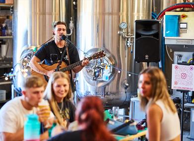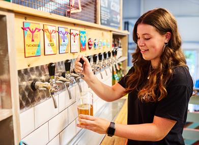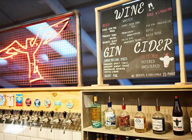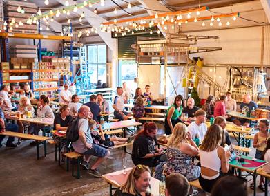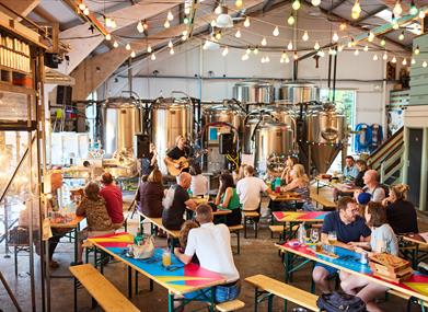 Our fun and vibrant brewery bar located overlooking our working brewery, is open 7 days a week with late hours from Thursday to Saturday. Check out our socials or website for all the latest information on our weekend food trucks, live music, special events and brewery tours. Both our bar and our shop hosts a wide range of our own tank fresh, draught and packaged beers, which are rotated seasonally with new additions popping up across the year as well as a cider, local gins and an extensive wine list. We are dog friendly, welcome children (always accompanied by an adult), and are a very refreshing pit stop for cyclists and walkers enjoying the Downs Link.